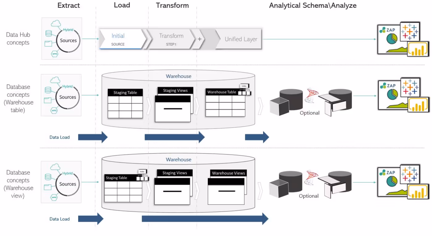 - A warehouse view – that is a direct query of the final staging view. A warehouse view provides an on-demand transform option.