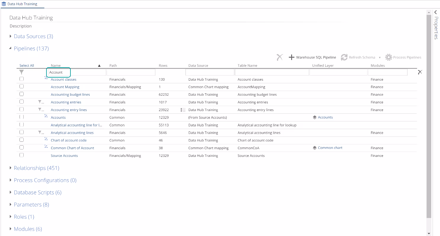 Modules – as described previously, Modules are tagged groups of Pipelines you are choosing to include from the Solution in your new Model. You can also filter by Module in Pipeline lists on various tabs.