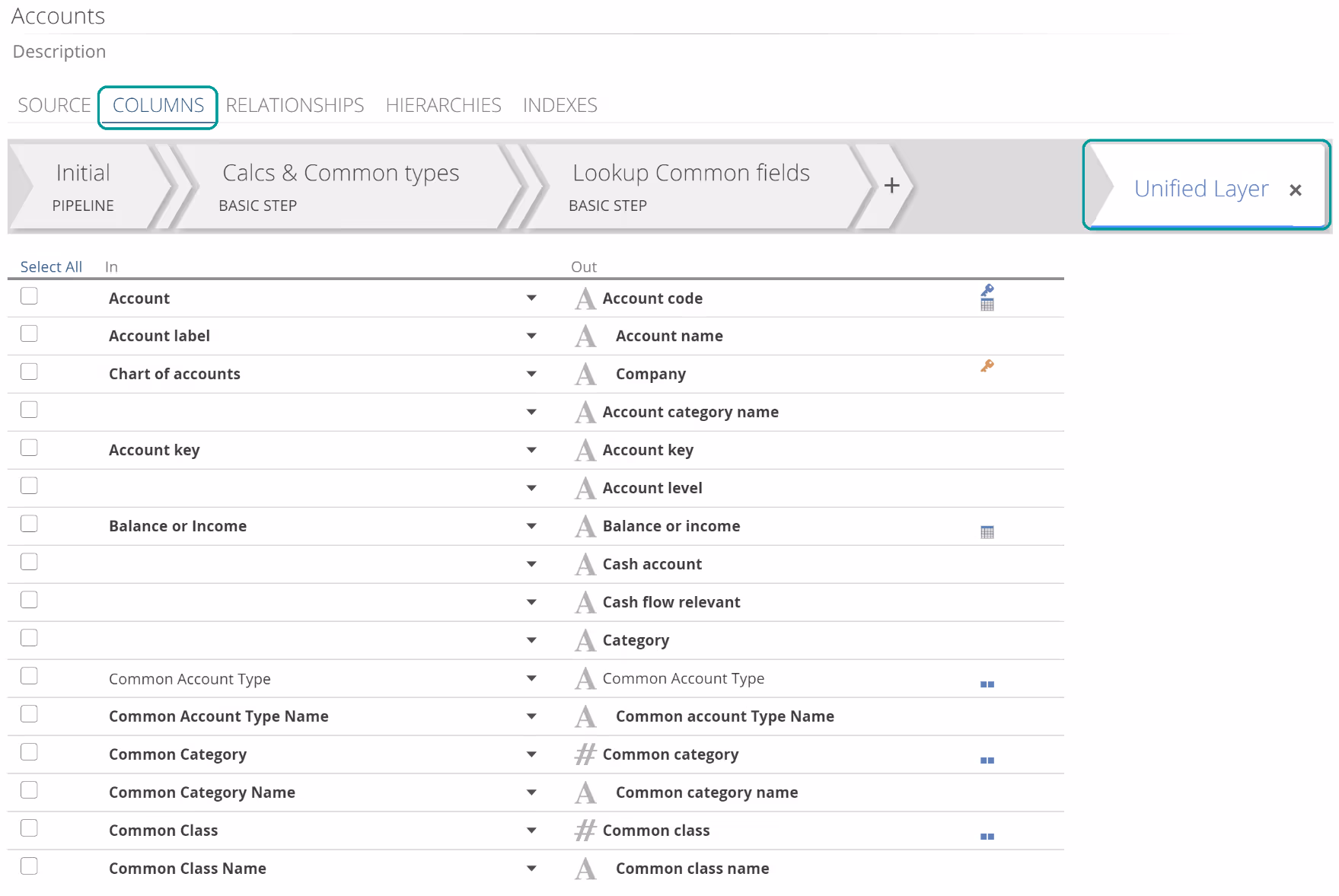 To sum up, Unified Layers standardize columns and Pipelines across models, primarily for use with a single suite of reports or analytics. In a sense, they provide a contract between the model and analytics. If the model adheres to the contract, then the analytics are guaranteed to work. If you have no intention of ever using the pre-built suite of analytics you may remove the Unified Layer steps so that the final step on each Pipeline is editable.