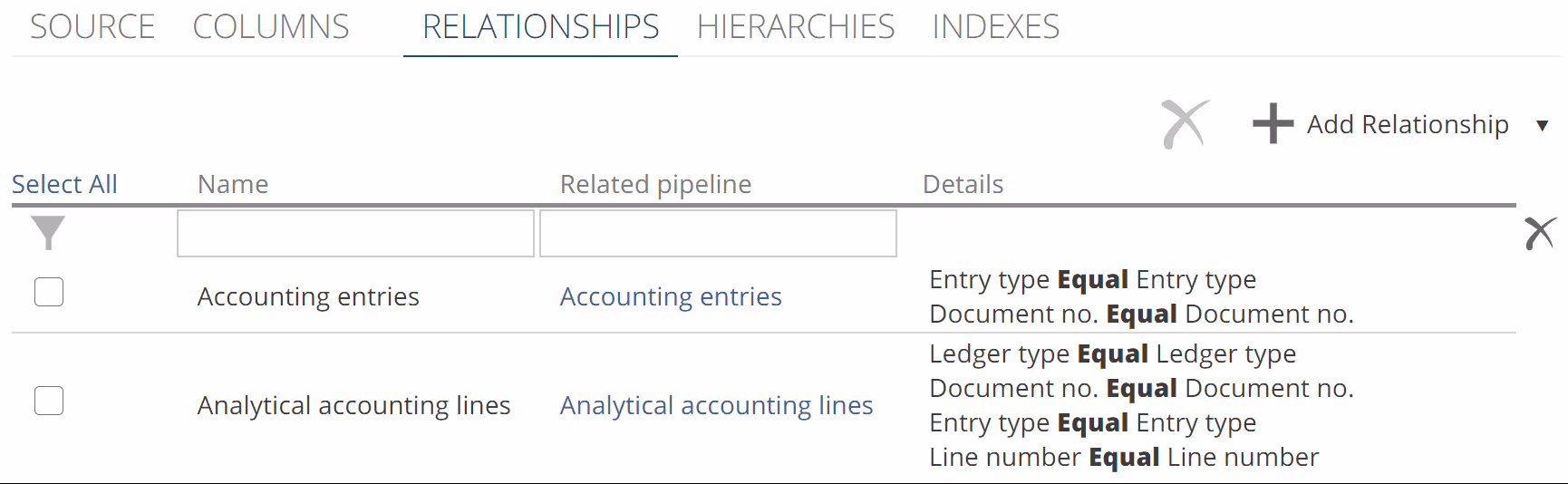 To this point, we have used relationships to support lookups. These relationships reside only in the Model resource. It is also possible to define relationships in the warehouse itself. These warehouse relationships may simplify reporting direct against the warehouse. This is because the reporting or analytic tool is already provided with information on how the tables relate. Warehouse relationships are entirely optional. It is also important to understand that warehouse relationships will only result if both the relating and the related Pipeline are configured with Create Pipeline Asset to Table.