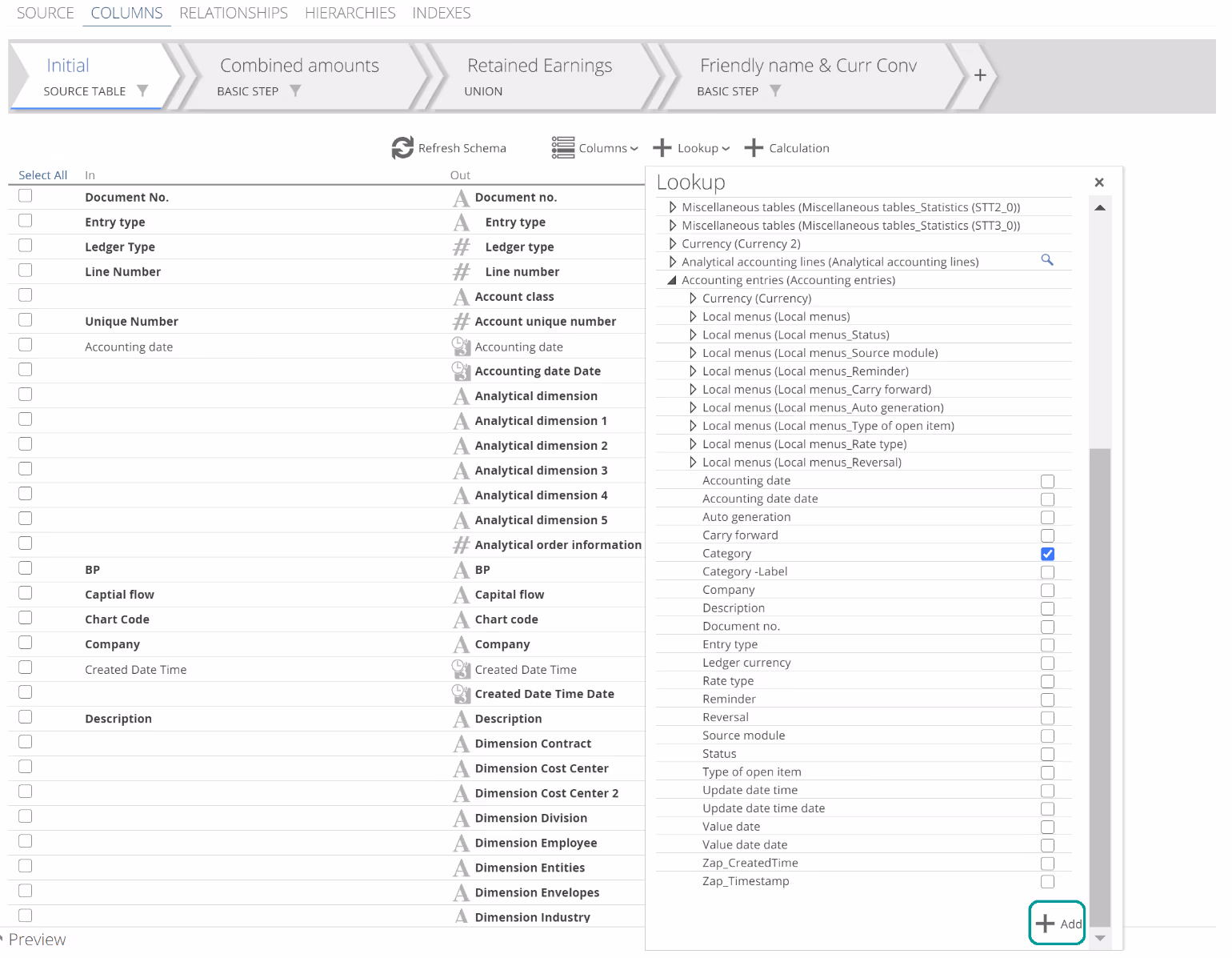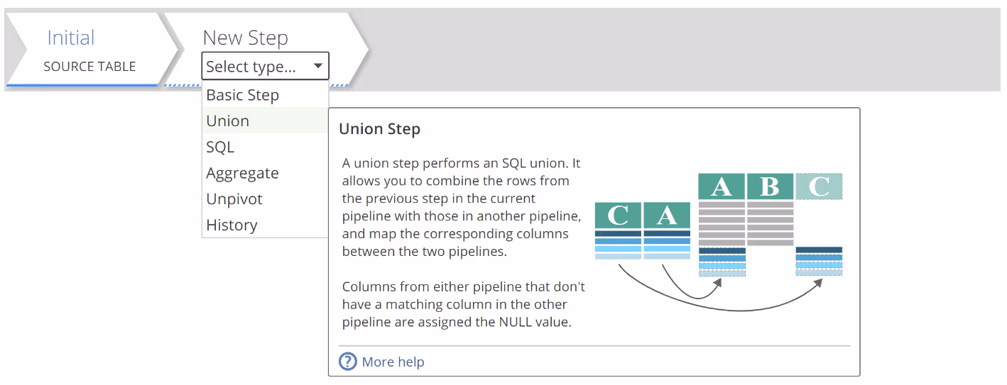Select the Pipelines to combine and click Add Pipeline as Union of Tables from the drop-down, as in the following image.