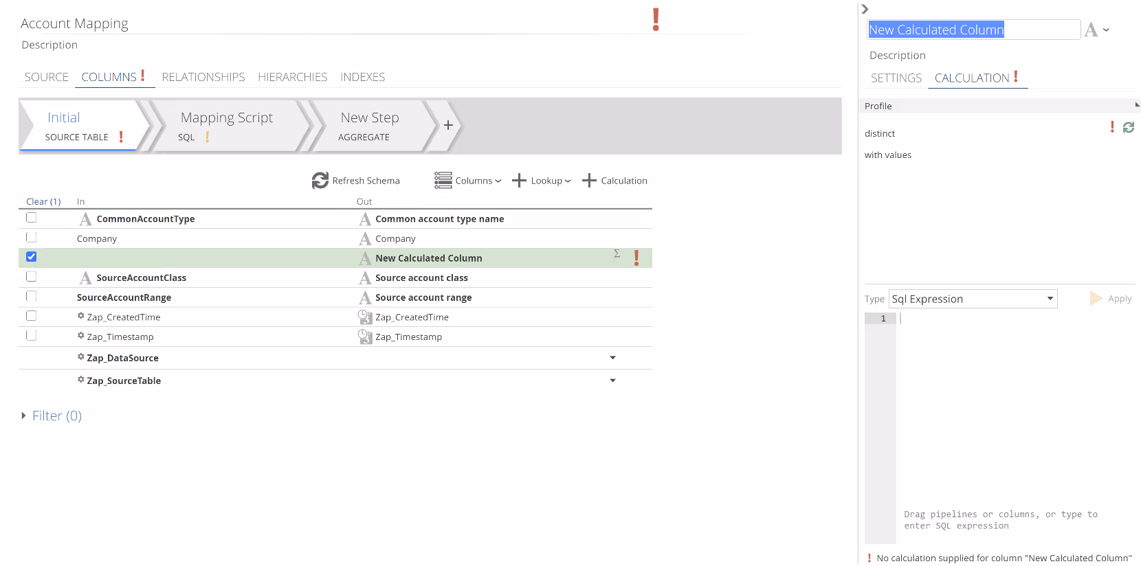 So we see that Unified Layers serve to standardize most column and Pipeline properties relevant to reporting. There is one more point to make on standardization. An applied Unified Layer will also serve to standardize the included columns. Observe the warning in the following image.