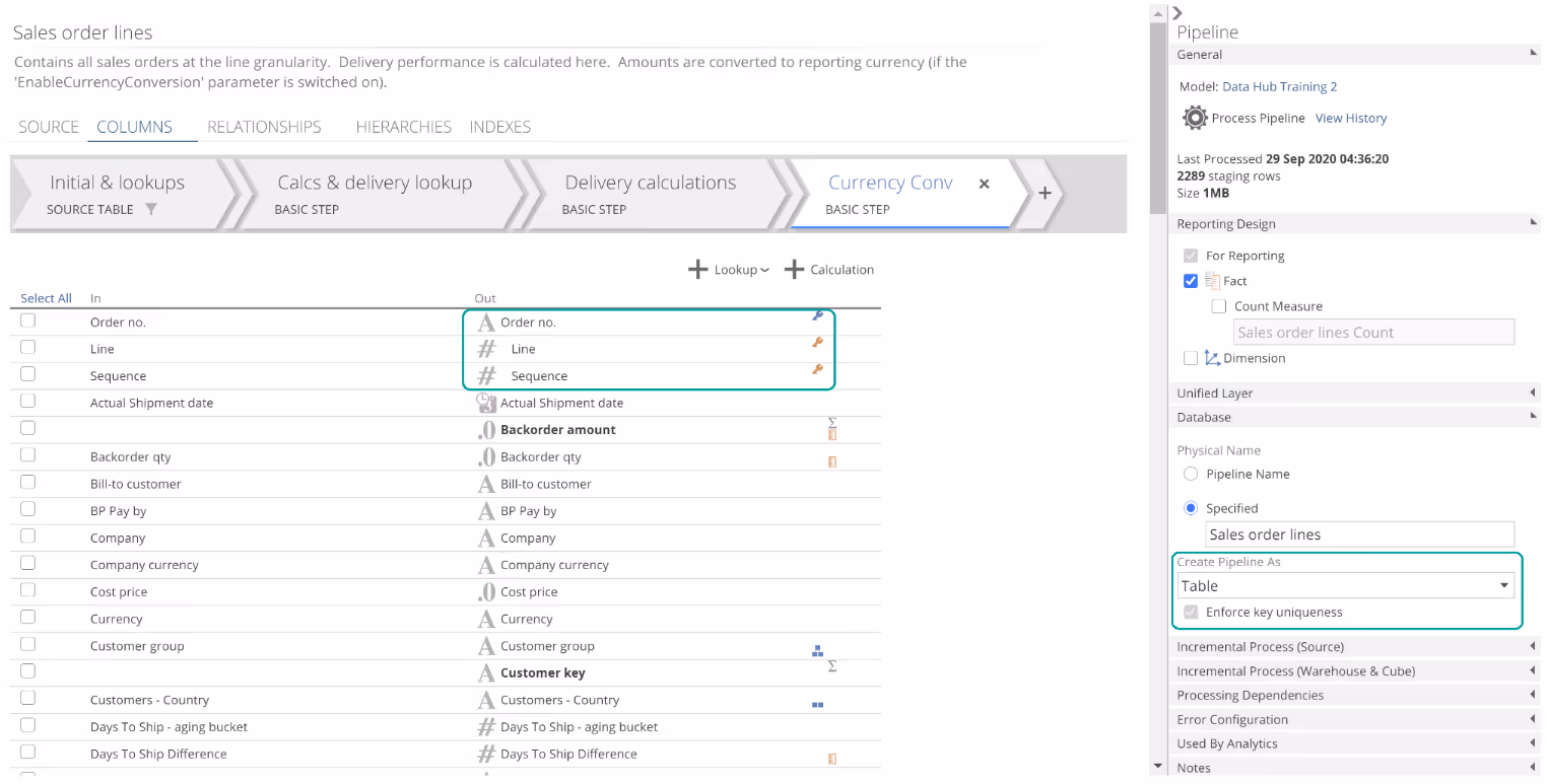 We have seen that it is a very bad idea to simply add key columns without first considering what is logically correct. Let's quickly discuss how best to configure Pipeline keys. Start with a minimal set of key columns for all pipelines, representing only the columns that you are certain are required. This minimal set is often automatically configured for you by Data Hub. Ensure there are no model validation warnings then process the Model. If you encounter a key violation, your assumptions about the source data for that Pipeline are wrong, or your modeling is in error.