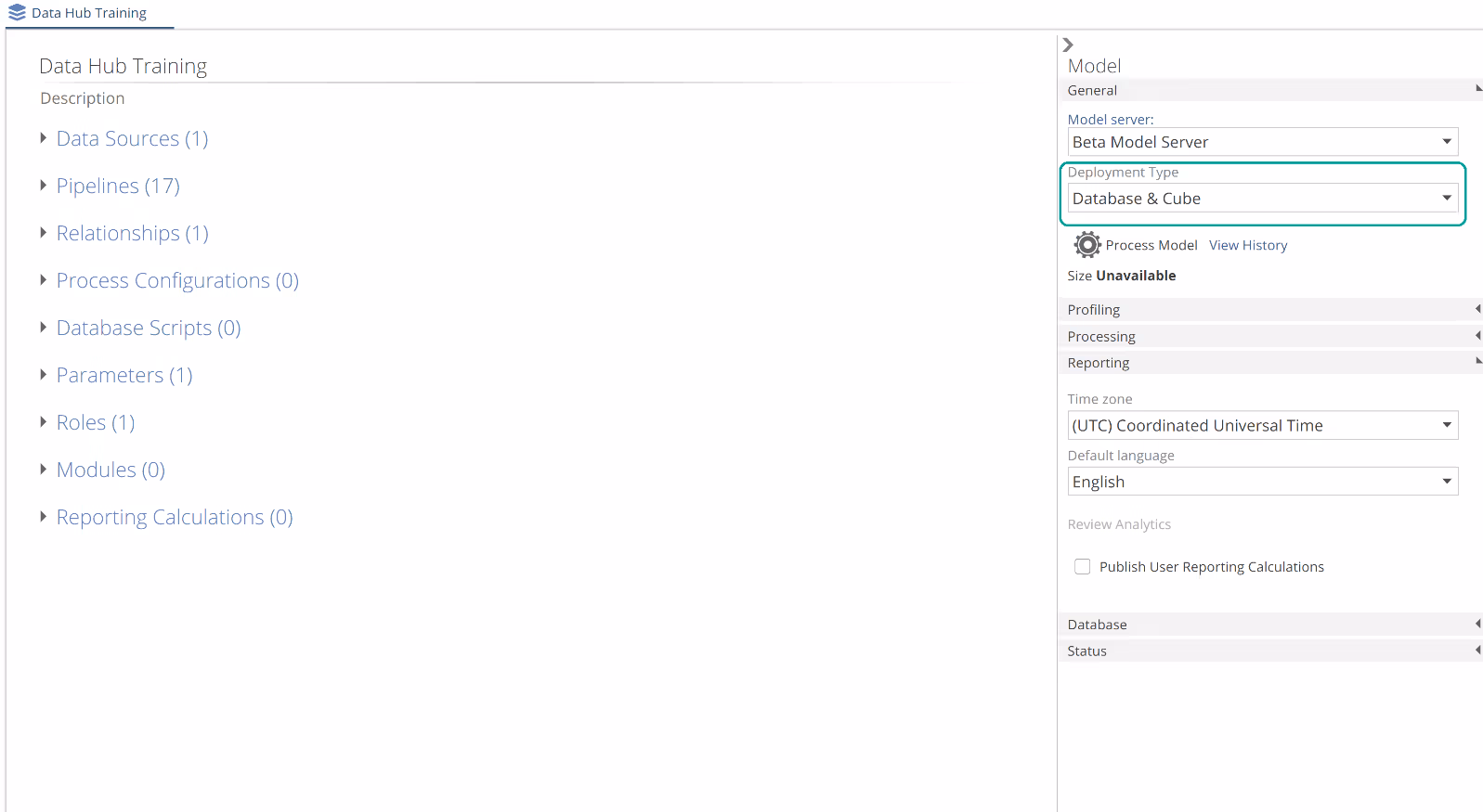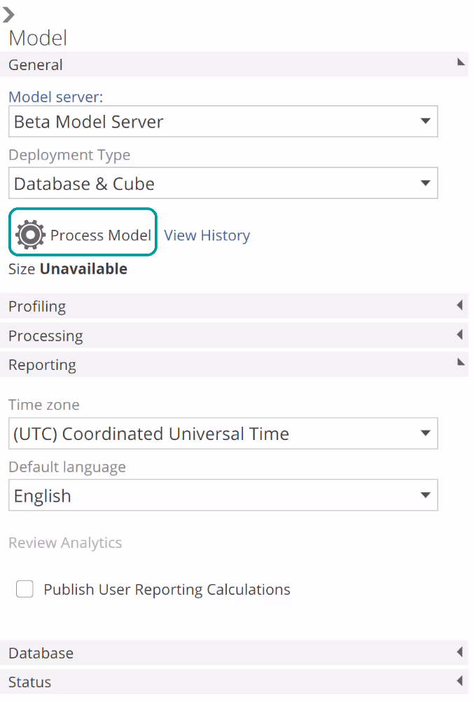 On the right-hand side of the Model resource tab is the Model design panel. At this point, you can choose whether you report against the warehouse or the semantic layer. If you are using Analytics with Data Hub or you plan to create custom analytics against the semantic layer, you should choose Database & Cube. Otherwise select Database. If you created your model from a Solution, you can click Process Model to build a complete warehouse (and optionally a cube).