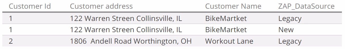 The duplicates here are obvious. Assuming the key for the Customers pipeline is currently Customer Id, this Model will fail at processing time (again this is desirable). One, potentially disastrous, approach to fixing this issue would be to include ZAP_DataSource in the key. With this additional key column in place, the combination of Customer Id and ZAP_DataSource is now unique for each row. However, it is logically incorrect to treat customers from our legacy sales system as different from customers from our incoming sales system. While the Model may process, reports against this data will be wrong! For example, counting the numbers of customers from the Customers pipeline would show nearly double the actual value. The correct approach to resolving the issue in this scenario would be to take only the new source records in the event of duplicates. Specific guidance on this approach and others can be found in the Resolve duplicate rows How-to article.