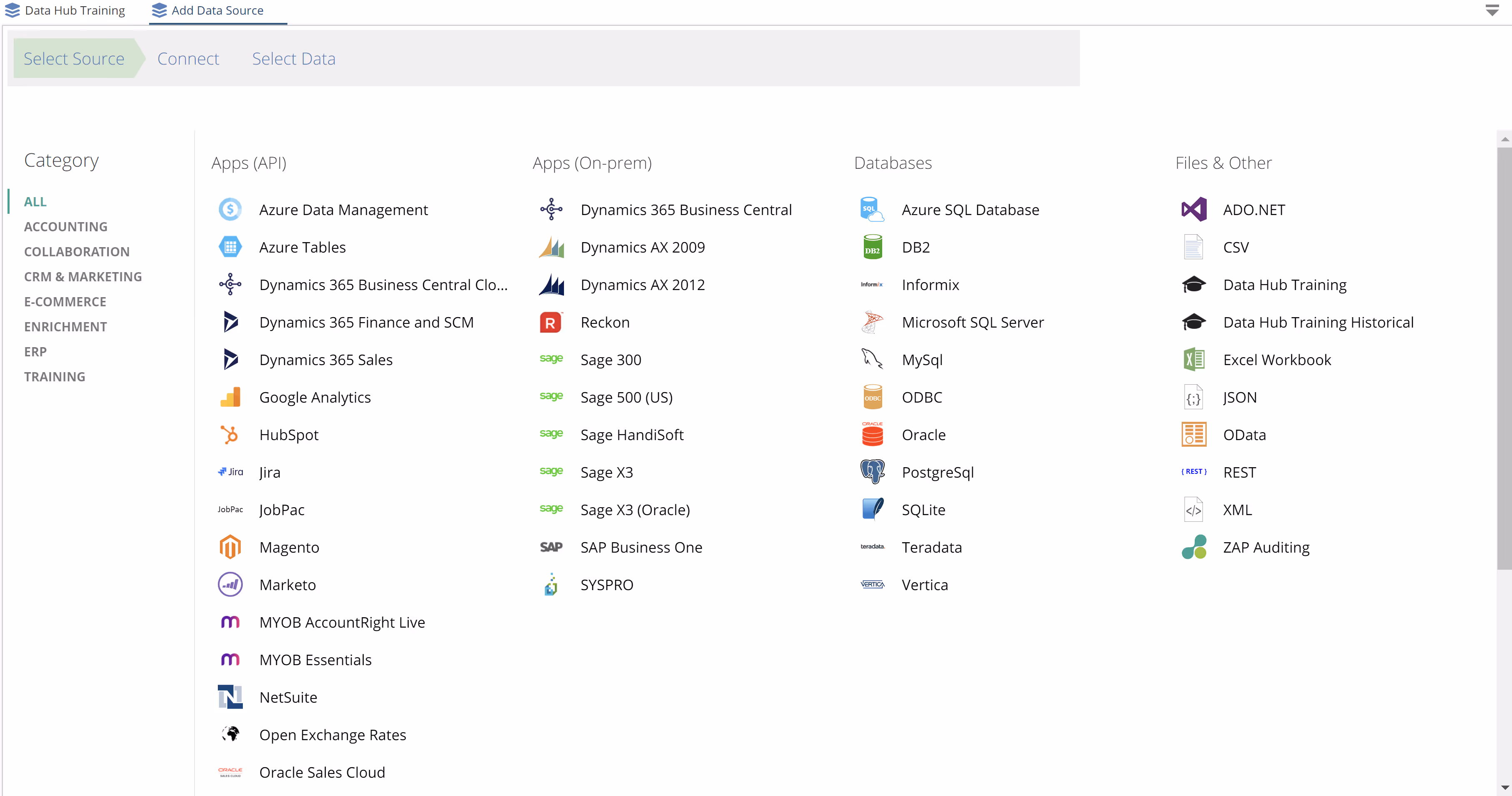 Having selected your source, you will see the now-familiar Connect and Select Data steps. Recall Select Data is where you choose the individual Pipelines for inclusion. The Data Hub Modeling Tutorial will provide you with the opportunity to practice adding an additional Data Source to a Model.