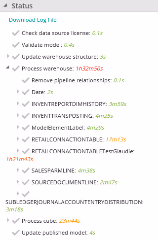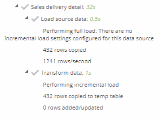 Additional information has been added to the model process tree. For every pipeline its possible to see the rows copied, rows per second and Incremental load setting (with a reason for a full load) for the source data, as well as the transform data. "Synchronized reporting calculations" now shows under the "Process cube" node.