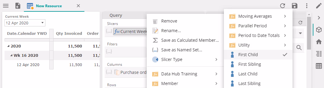 These functions are often use with a Date hierarchy, combined with a Current period functions such as Current Month. For example, First Child could be used to return the first day of the Current Month