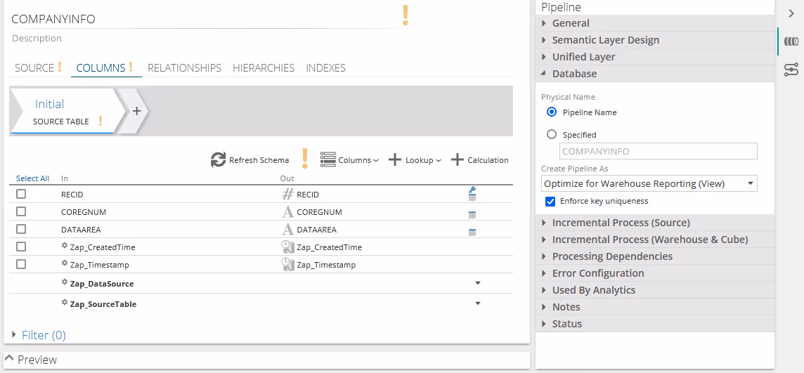 Pipeline and column physical name behavior has been improved. Physical names are the names of tables in the data warehouse. Where Captions are available for data sources like Dynamics, SAP, SYSPRO and Sage they will be used as the physical column and pipelines names in the warehouse.