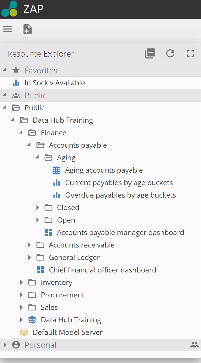 The resource explorer stores and provides access to all data hub resources like analyses, dashboards, and models, in a hierarchical format.