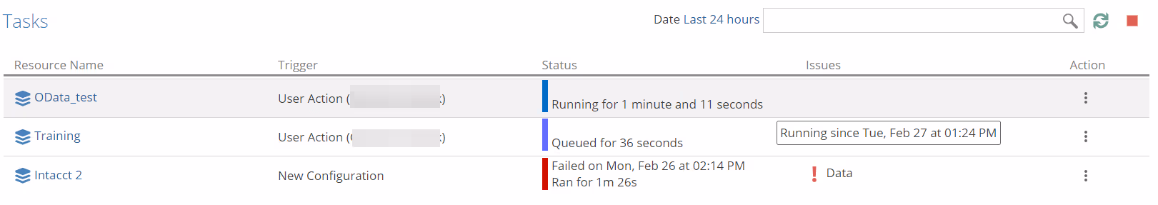 The Task list: This pane lists all tasks within Data Hub, that has had process tasks. It will list all processes with status of queued, succeeded, failed or running. It will provide the user or system action that triggered the process, as well as the duration of the process. The ellipses under the action column provide the ability to download the process log file or cancel a process.